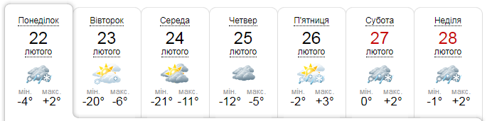 24 лютого: хмарно, без опадів. Вітер східний, південно-східний 2.4-3.3 м/с. Вночі очікується −21, вранці стовпчики термометрів триматимуться на позначці −18, вдень −11, увечері −15.