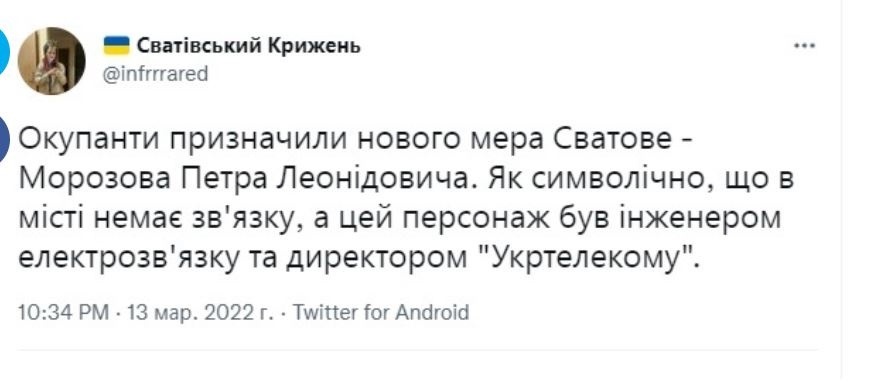 «Окупанти призначили нового мера Сватове — Морозова Петра Леонідовича. Як символічно, що в місті немає зв'язку, а цей персонаж був інженером електрозв'язку та директором «Укртелекому», — пише користувач під нікнеймом «Сватівський Крижень».