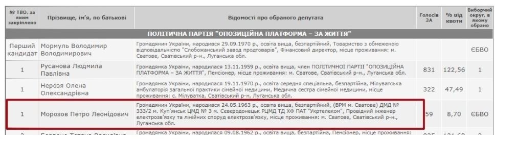 Довідка: Морозов Петро Леонідович — 24.05.1963 року народження. Має вищу освіту. Проживає у Сватовому, у 2020 році обраний депутатом Сватівської районної ради Луганської області за списками Політичної партії «Опозиційна Платформа – ЗА ЖИТТЯ». На сайті ЦВК України є інформація, що Петро Морозов працював в «Укртелекомі».