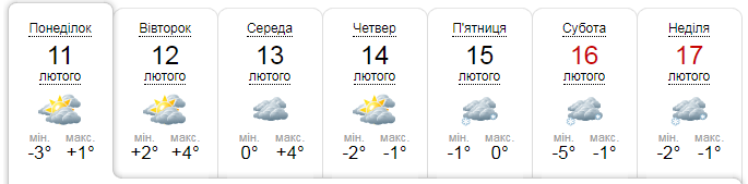 У понеділок — 11 лютого, весь день буде хмарно і без опадів. Температура повітря від −3 вночі і до +1 вдень.