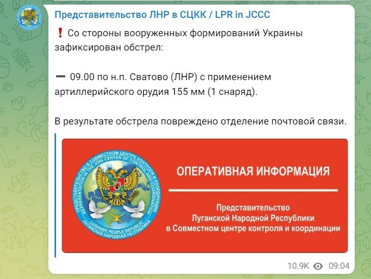 Фейкове представительство т.зв. “ЛНР” в СЦКК повідомило, що 19 грудня о 09:00 (за московським часом) по Сватовому стався обстріл одним артилерійським снарядом калібром 155 мм.