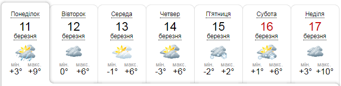 11 березня вдень і увечері +8. Посилення вітру до 15-24 м/с. Протягом дня буде похмуро. Ближче до вечора прогнозують дрібний дощ. Він розпочнеться після обіду, а до вечора може посилитися.