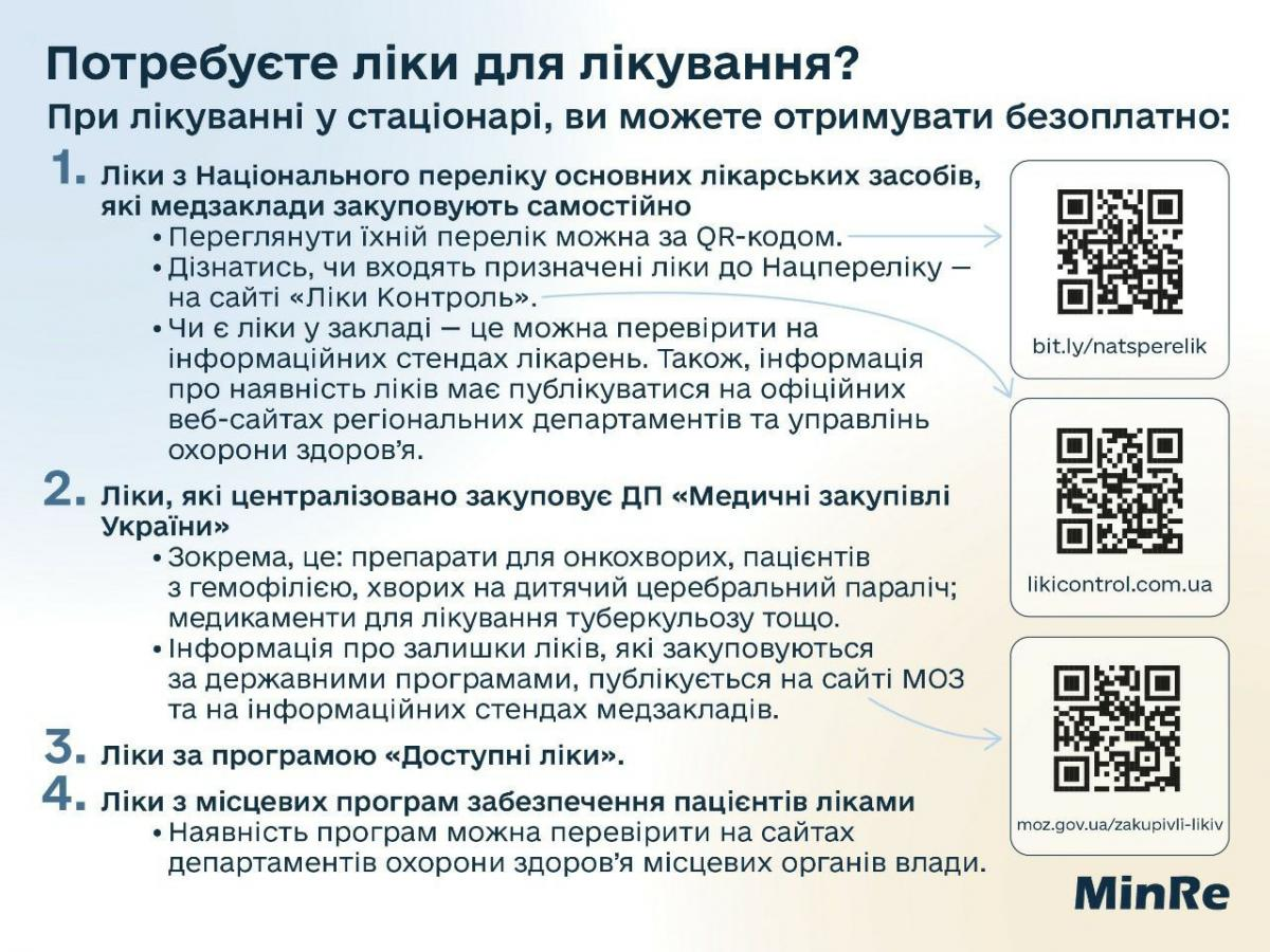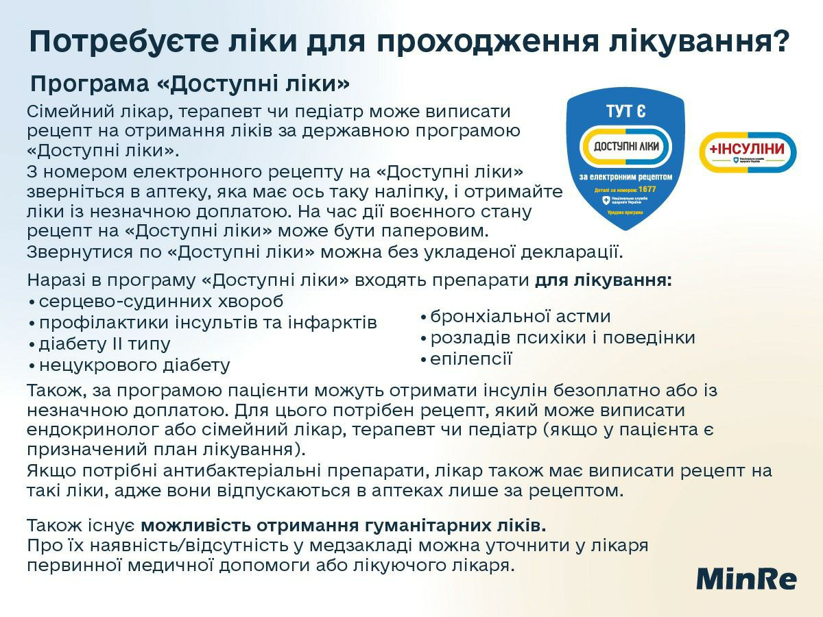 Для переселенців в аптеках продовжує працювати програма «Доступні ліки». Пацієнти, які потребують амбулаторного лікування серцево-судинних захворювань, цукрового діабету першого/другого типу, нецукрового діабету, бронхіальної астми, розладів психіки та поведінки, епілепсії, можуть отримати лікарські засоби, що входять до програми, безоплатно або з невеликою доплатою.