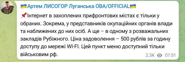 "Інтернет у захоплених прифронтових містах є тільки в обраних. Зокрема, у представників окупаційних "органів влади" та наближених до них осіб. А ще - в одному з розважальних закладів Рубіжного", - повідомляє Артем Лисогор.