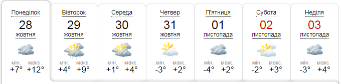 30 жовтня увесь день хмарно, але без опадів. Вранці +3, вдень +4, увечері +1.