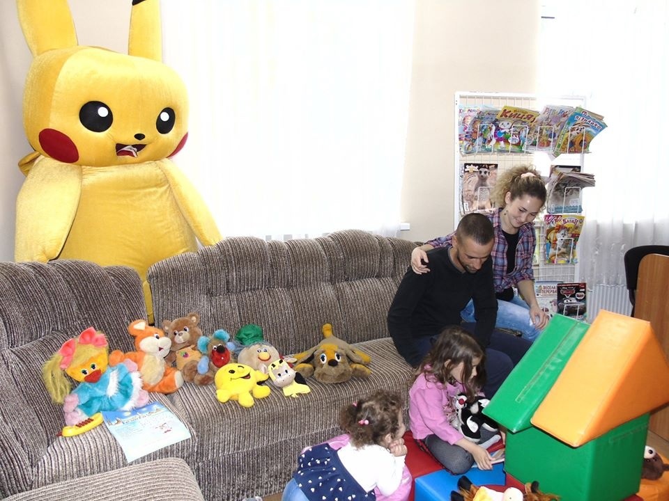Дитяча ігрова кімната розрахована на дошкільнят та молодших школярів. Поряд з полицями, де розташовані унікальні, сучасні книжки з яскравими обкладинками, облаштоване імпровізоване казкове містечко з ігротекою, мультизалом, куточком відпочинку та сухим басейном.
